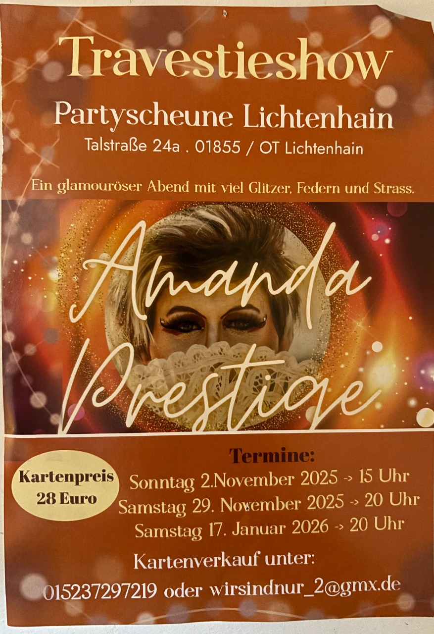 Bei der Travestie-Show mit Amanda Prestige in der Partyscheune Lichtenhain erwartet Sie ein schillerndes Feuerwerk aus Tüll, Strass und großen Gefühlen. Freuen Sie sich auf mitreißende Comedy, beeindruckenden Gesang, schwungvollen Tanz und jede Menge überraschender Momente. Lassen Sie den Alltag hinter sich und entdecken Sie eine bunte, schrille Welt, die verzaubert, berührt und zum Träumen einlädt. Dieser Abend bleibt garantiert unvergessen – vielleicht träumen auch Sie danach davon, selbst einmal in High Heels im Rampenlicht zu stehen.